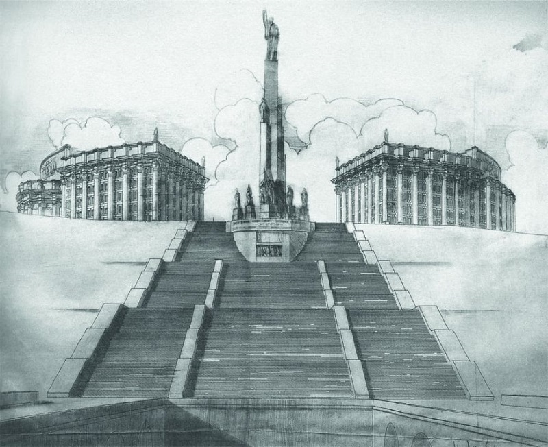 Таr, ви зрозуміли, про кого я. Під час розробки стилю фільму були взяті до уваги креслення нереалізованого радянського проекту перебудови Москви (та і Києва). Для прикладу: будівля МЗС на Михайлівській площі планувалася як половинка, в неї повинен був бути брат-близнюк на місці Михайлівського собору, а між цими двома монстрами з колонами мав би височіти вождь. Вождь такого розміру, щоб у Броварах було видно!